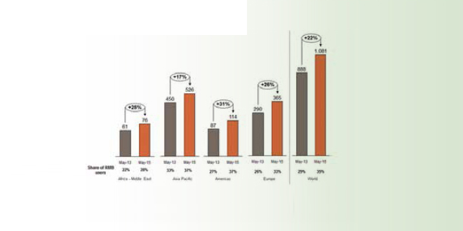 In May 2015, RMB adoption for payments by financial institutions in Asia Pacific increased to 37 per cent from 33 per cent in May 2013. During the same time period, the Americas experienced even stronger growth with financial institutions increasing their use of the RMB for payments by 10 per cent, leading, again, to 37 per cent adoption.