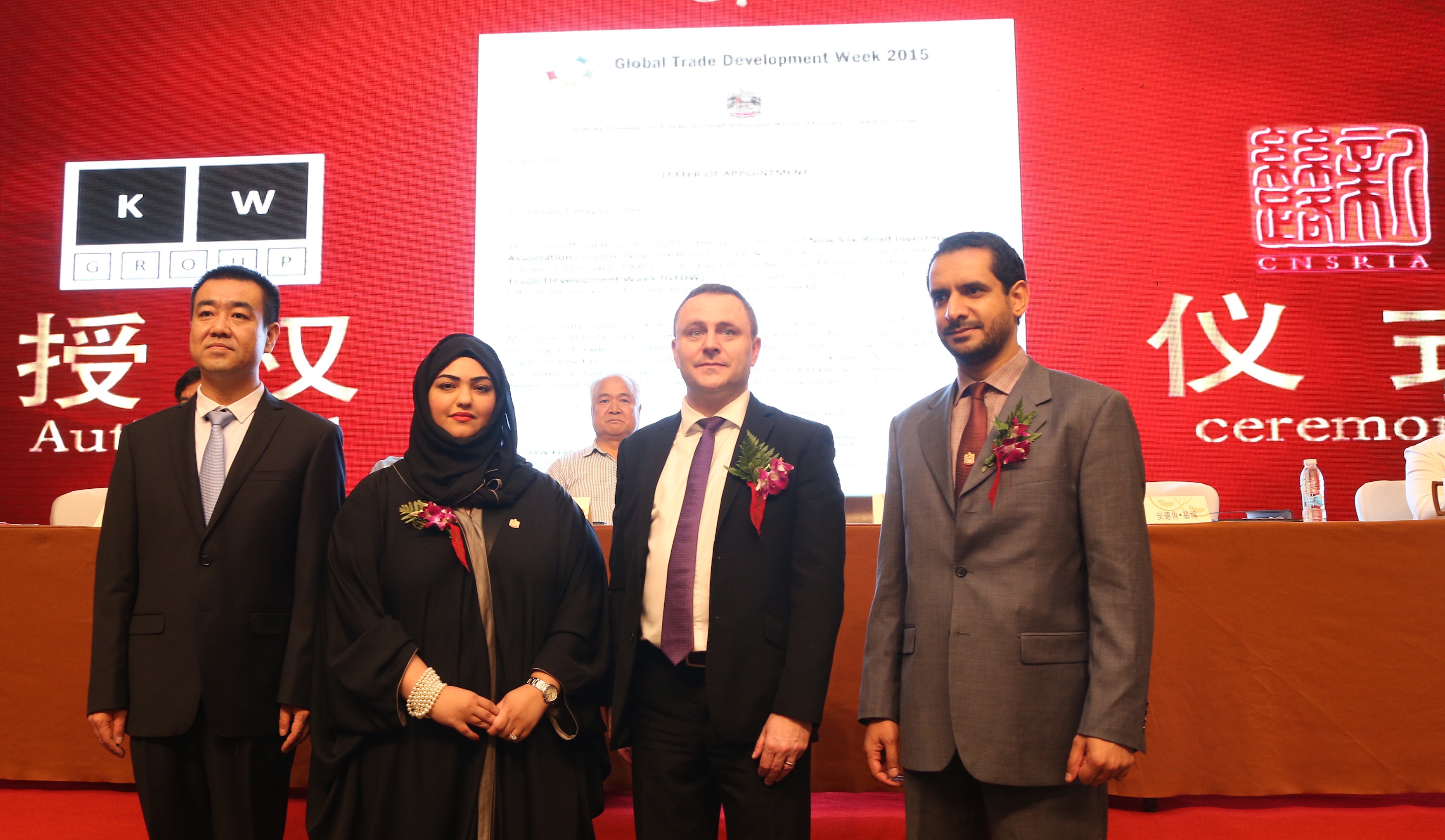 Xian China – 24th May 2015 – The Global Trade Development Week (GTDW) team led by Ms. Ayesha Alkobaisi, Director of International Trade Organisations at the UAE Ministry of Economy and Project Director for GTDW, yesterday participated in a press conference to announce an agreement between GTDW and China New Silk Road Investment Association (CNSRIA). In the agreement, CNSRIA has pledged to promote Global Trade Development Week to the Chinese government and enterprises and to strengthen trade relations between the UAE and China. The GTDW team, joined by H.E. Badir A. Al Musharrekh, UAE’s Commercial Attaché in China also attended the 19th Investment and Trade Forum for Cooperation between East & West China and the Silk Road International Expo and high-level bilateral meetings with the Chinese government and business owners.