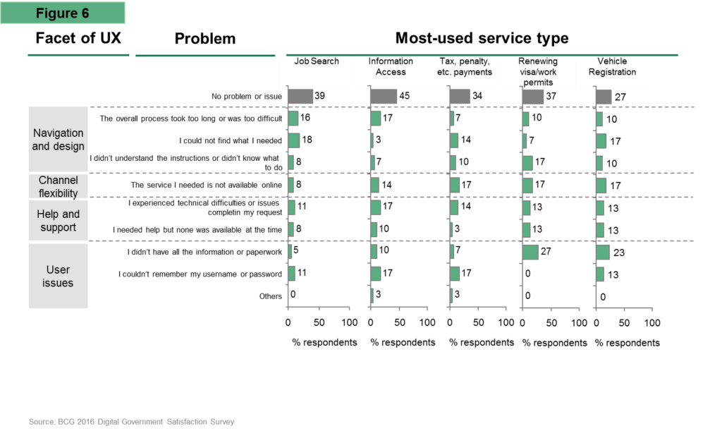 In general, UAE users are satisfied with digital services across attributes, and no single service seems to be associated with presenting the most problems; having said that, 73% of UAE users faced a problem while using e-government services. The most pressing concerns for surveyed citizens were that the service they needed was not available online, the overall process was too long or difficult and they could not find what they needed. Among the most-used services, respondents faced the most problems with vehicle registration, with 23% stating they did not have all the information or paperwork required.