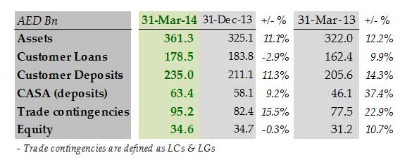 - Asset growth of 11.1% sequentially and 12.2% year-over-year to AED 361.3 billion in 1Q 2014 was primarily led by increased liquidity.