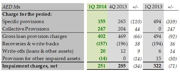 Net impairment charges were AED 251 million in 1Q 2014, down 12% versus 4Q 2013 and 22% versus 1Q 2013, driven by improving asset quality and recovery in collateral values. Specific provision charges were lower by AED 110 million sequentially and AED 339 million year-over-year, partially offset by increases in collective provision charges of AED 44 million sequentially and AED 247 million on growth in credit risk-weighted assets.