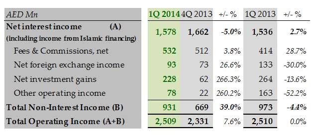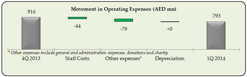 Net fees and commissions, a key focus area for the bank, continued to growand were up 3.8% sequentially and 28.7% year-over-year. Net FX income and investment gains were up sequentially as a result of continued momentum in our flow businesses. Both FX and investment income were down on a reported basis when compared with 1Q 2013; however, the underlying trends in both businesses continue to improve.Other operating incomewas AED 78 million in 1Q 2014, which reflected an increase from AED 22 million in 4Q 2013 and a decline from AED 163 million in 1Q 2013, which included exceptional gains from hedging strategies which did not repeat in 1Q 2014.