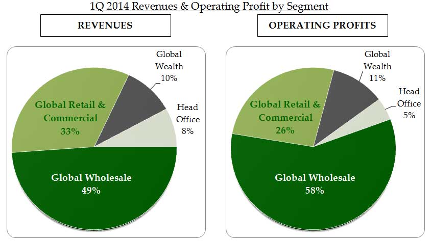 Operating profits grew 21.3% sequentially to AED 1.716 billion in 1Q 2014 versus 4Q 2013. Operating profits by segment were AED 998million (58%)in Global Wholesale Banking, AED 185million (11%) in Global Wealth and AED 455million (26%) in Global Retail and Commercial. Head Office had a net contribution of AED 78 million (5%).